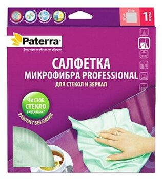 Салфетка микрофибра PROFESSIONAL, для стекол и зеркал, 35 * 35 см, в картонной упаковке, PATERRA