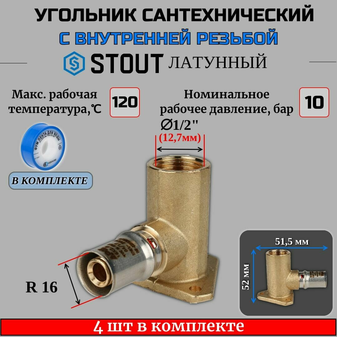 Купить Угольник настенный с креплением удлинённый 1/2"х16 4 шт для металлопластиковых труб прессовой ФУМ лента 10 м