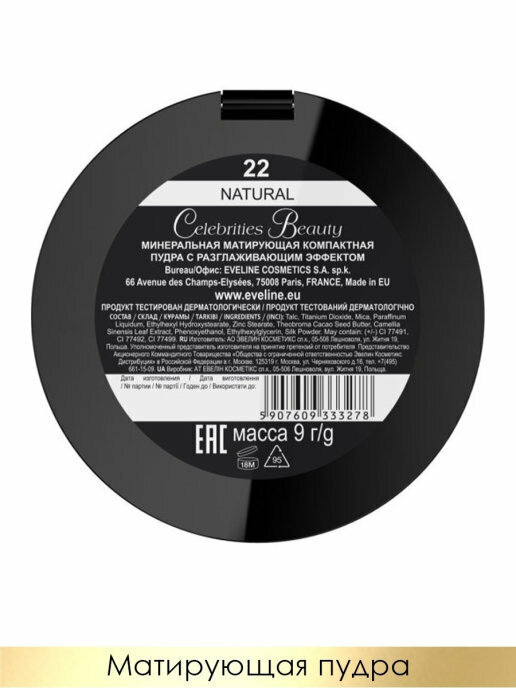 Купить Eveline Celebrities Beauty Минеральная матирующая компактная пудра для лица 9 г. № 022 натуральный