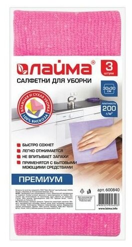 Салфетки универсальные, комплект 3 шт., 30х30 см, 200 г/м2, вискоза (ткань), LAIMA премиум колор, 600840 интересное: