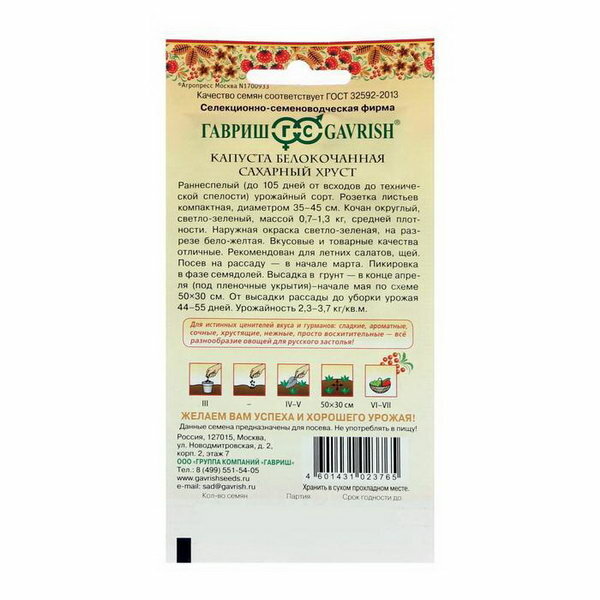 Гавриш Семена Капуста белокочанная "Сахарный хруст", ранняя, 0,5 г интересное: