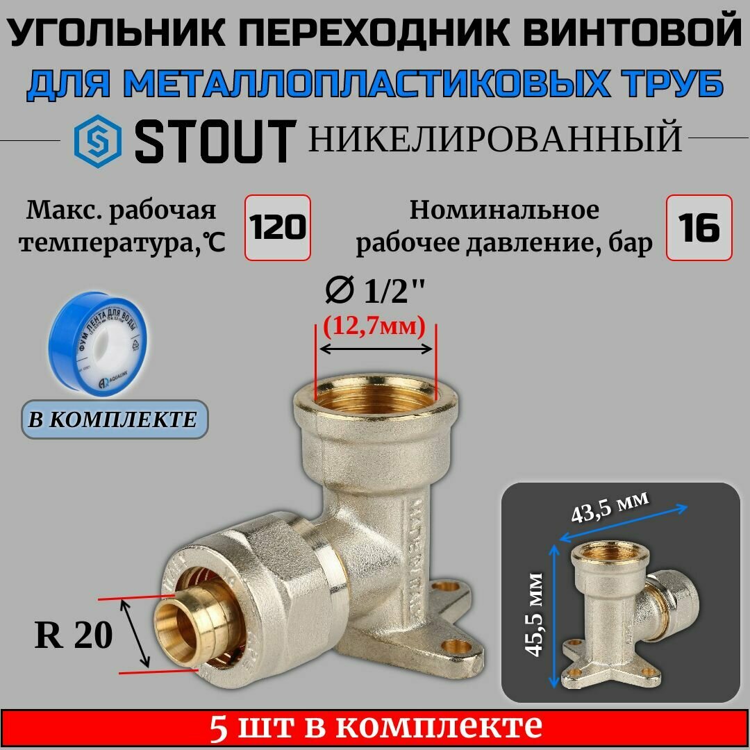 Купить Угольник настенный с креплением 1/2"х20 5 шт для металлопластиковых труб винтовой ФУМ лента 10 м