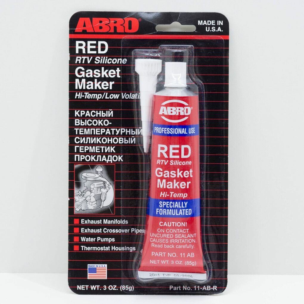 ABRO 11-AB Герметик 85гр - прокладочный красный силиконов. на уксусной основе для клапанных крышек, масл. насосов, водяных помп, крышек КПП, дифференциалов и др., до 343С