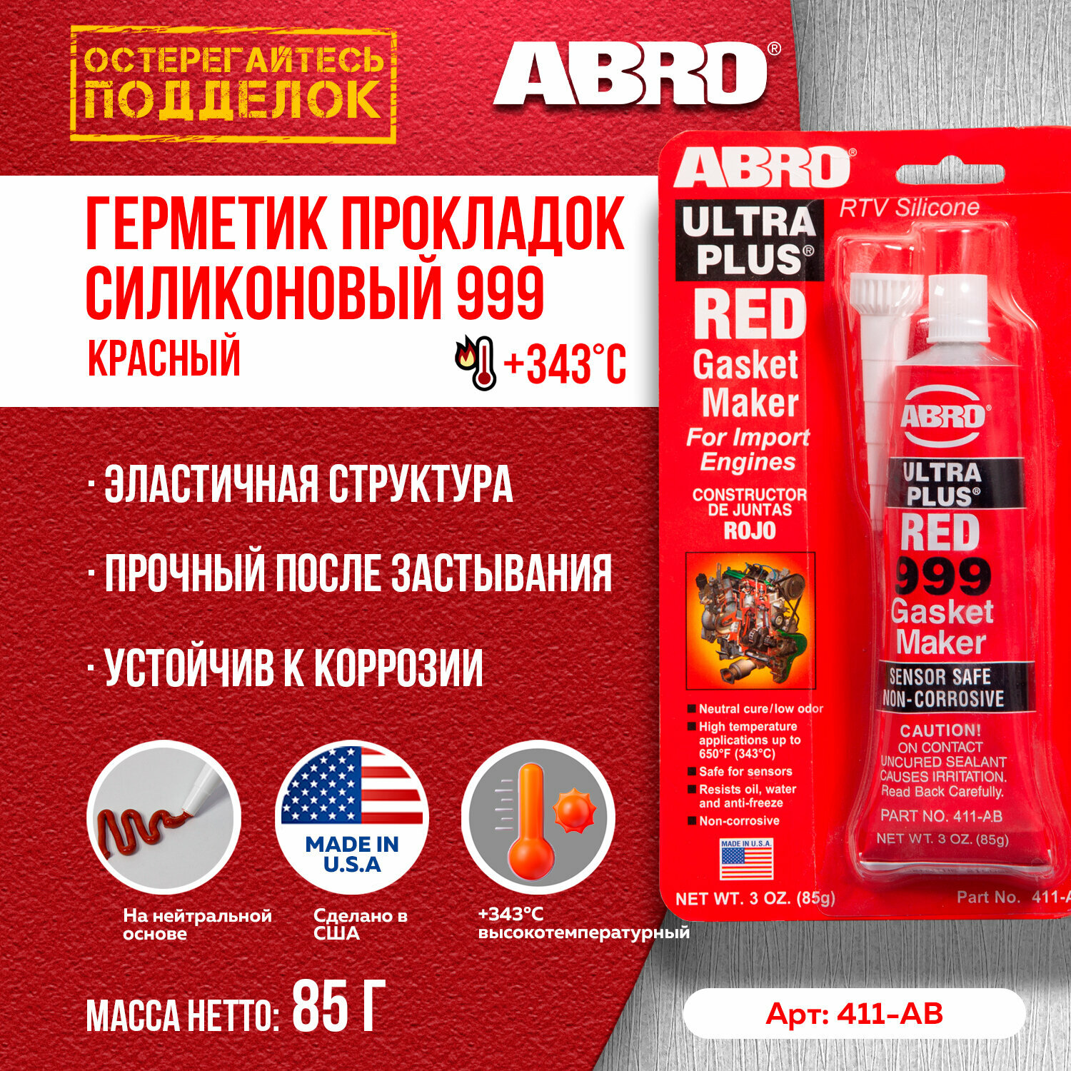 Герметик прокладка "ABRO" Ultra Plus (85 гр) (красный, силиконовый ) ABRO 411-AB | цена за 1 шт