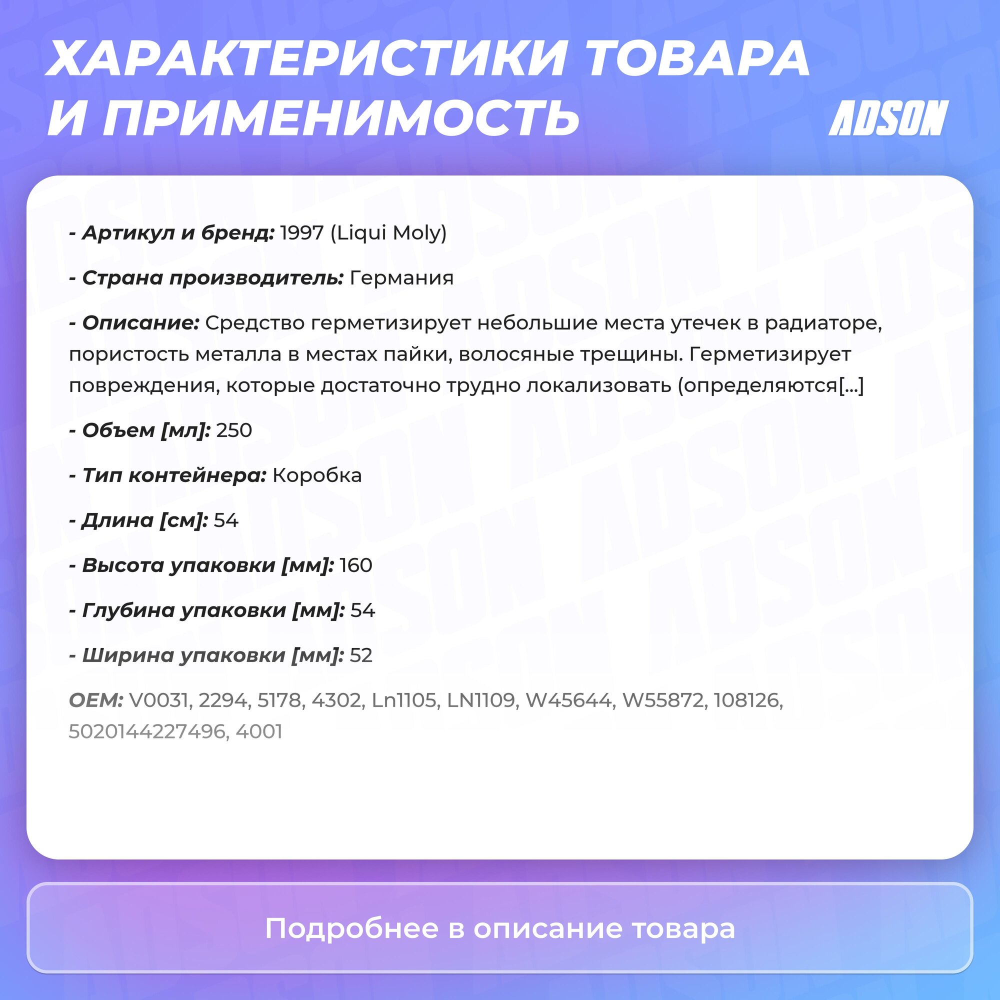 | Отзыв: | Брал для грузовой машины 40литров система охолождения тек радиатор медный 3 флаконе залил не течёт |
