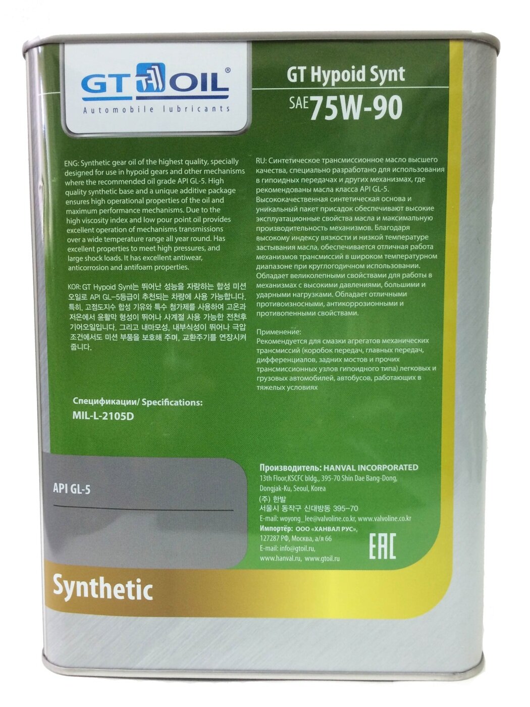 GT OIL Масло Hypoid Synt, SAE 75W-90, API Gl-5, 4л 8809059407875 .