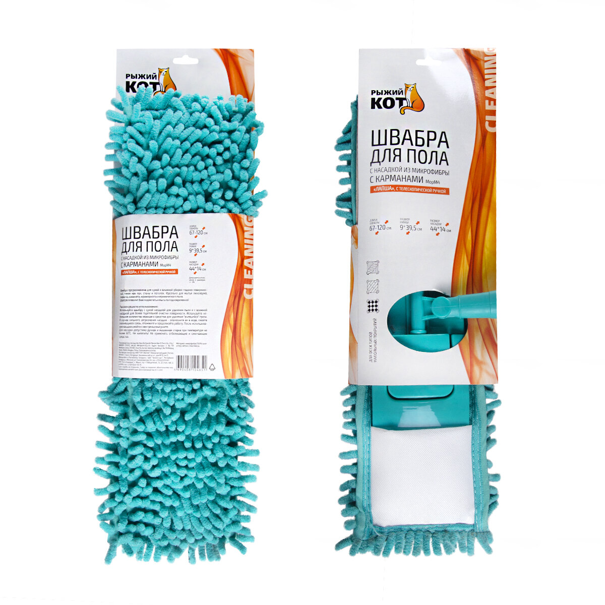 Швабра насадка микрофибра Лапша 14*44см,ручка тел.мет120см,карманы МОРМ4, 310416 Рыжий Кот