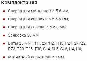 | Плюсы: | Прекрасная комплектация. Сверла. Биты.