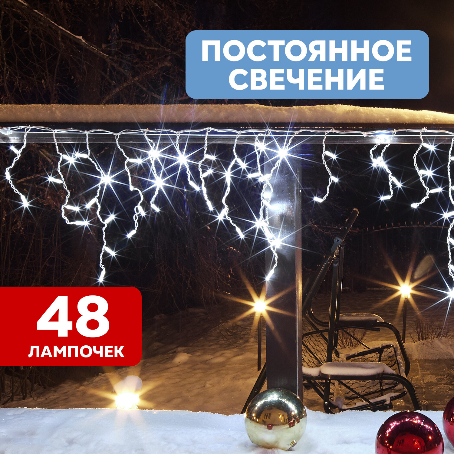 Гирлянда Айсикл (бахрома) светодиодный, 1,8 х 0,5 м, белый провод, 230 В, диоды белые, 48 LED