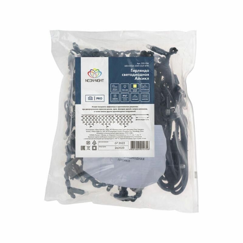 Купить Гирлянда светодиодная "Айсикл" (бахрома) 4.0х0.6м черн. провод 2.3мм 230В теплый бел. 128 LED Neon-Night 255-226-6
