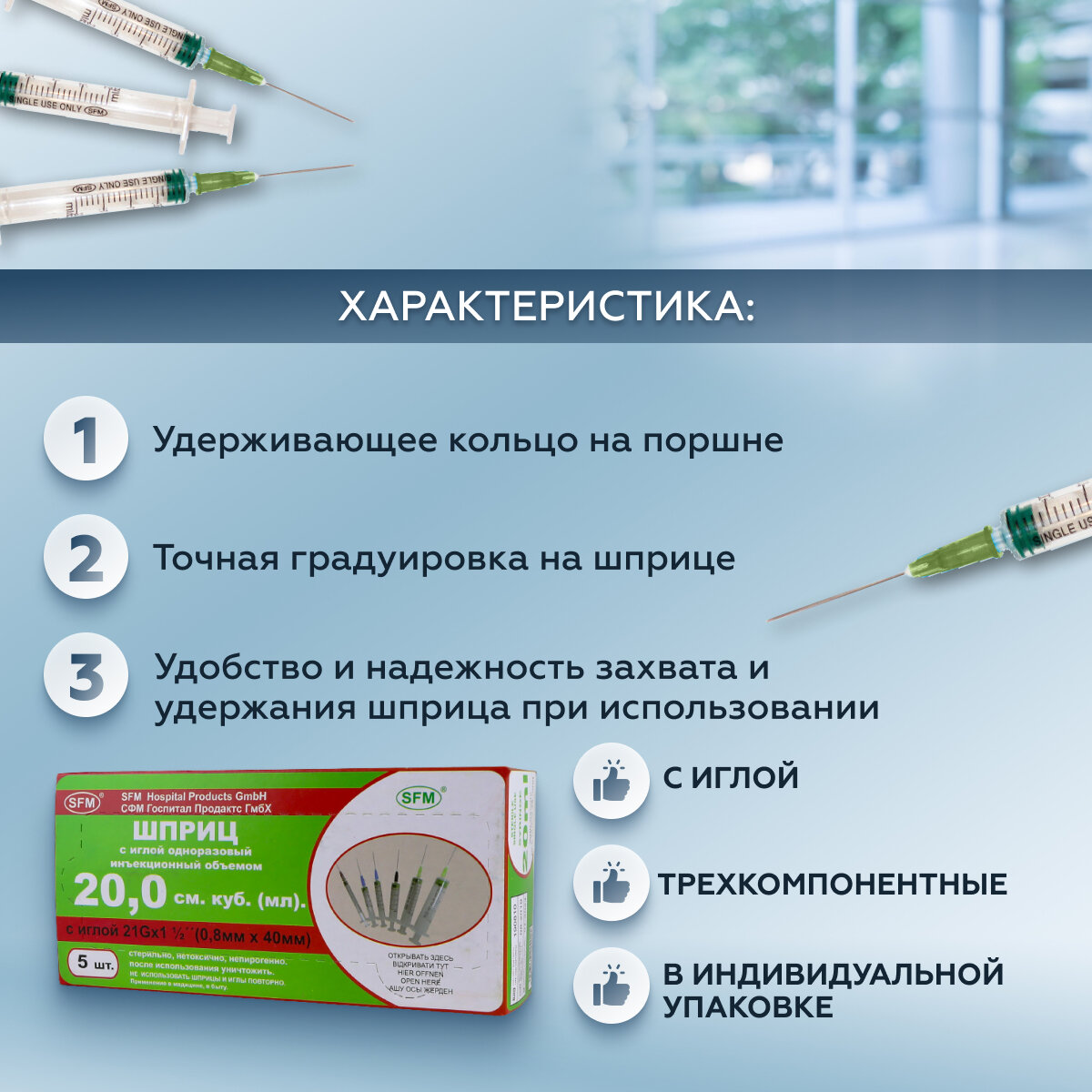 Шприц 20мл (3-х компонентный) SFM, одноразовый, стерильный, с иглой 0,8 x 40 - 21G, упаковка №5 (без латекса) ( блистер)