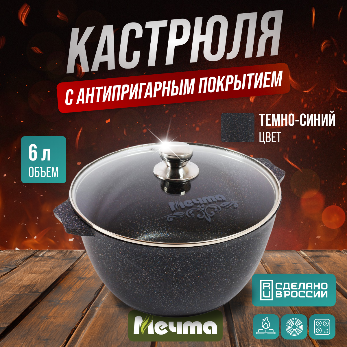 Кастрюля 6 л. антипригарная с крышкой мечта 46802