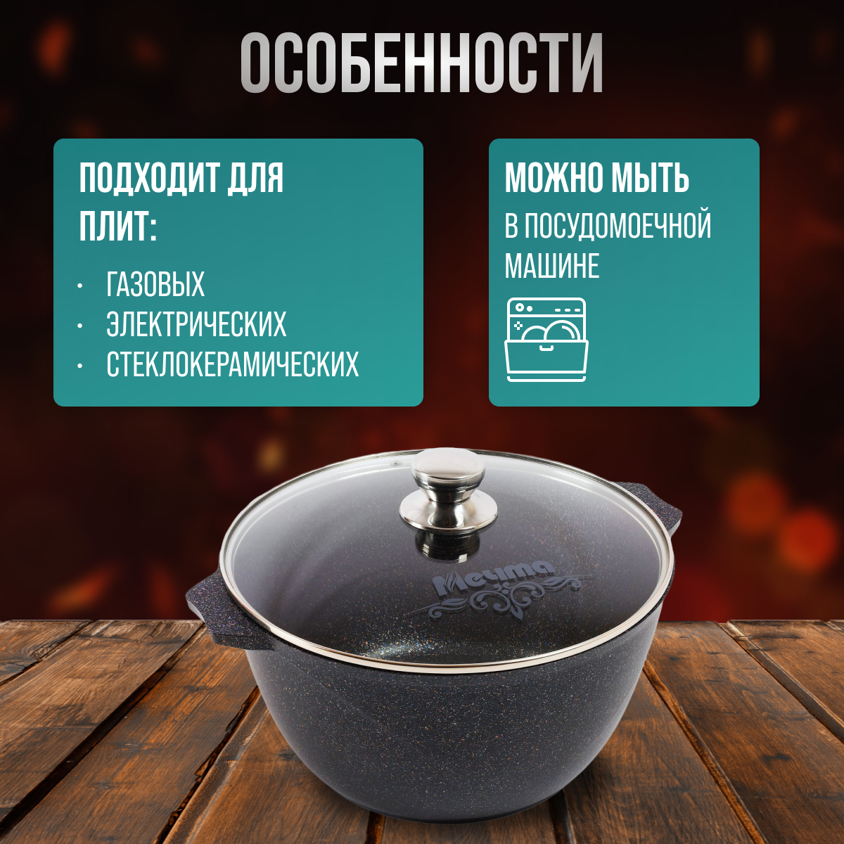 Кастрюля Мечта Гранит Black литая с антипригарным покрытием, со стеклянной крышкой, 6л, гранит black