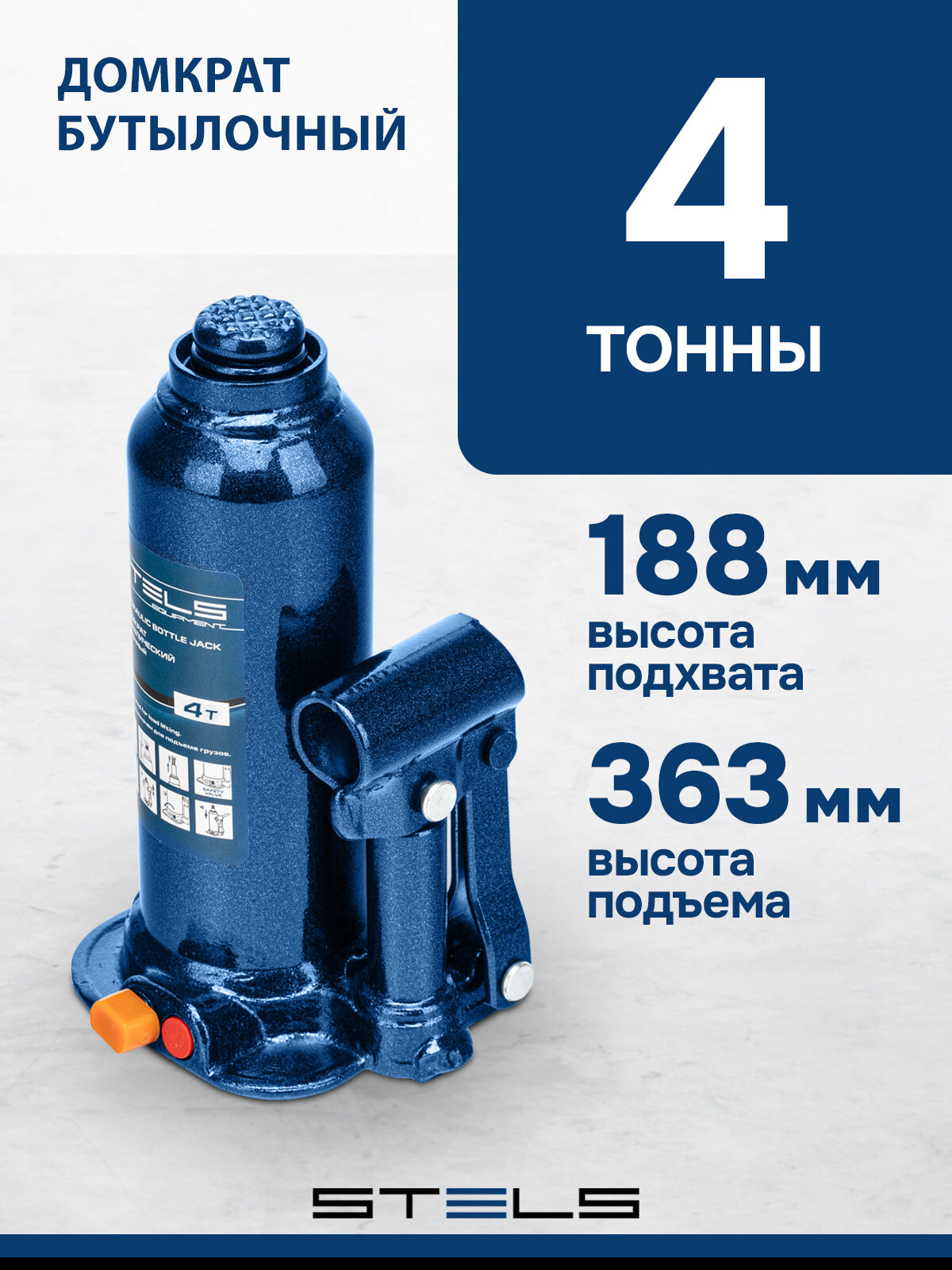 Домкрат гидравлический бутылочный, 4 т, h подъема 188–363 мм// Stels
