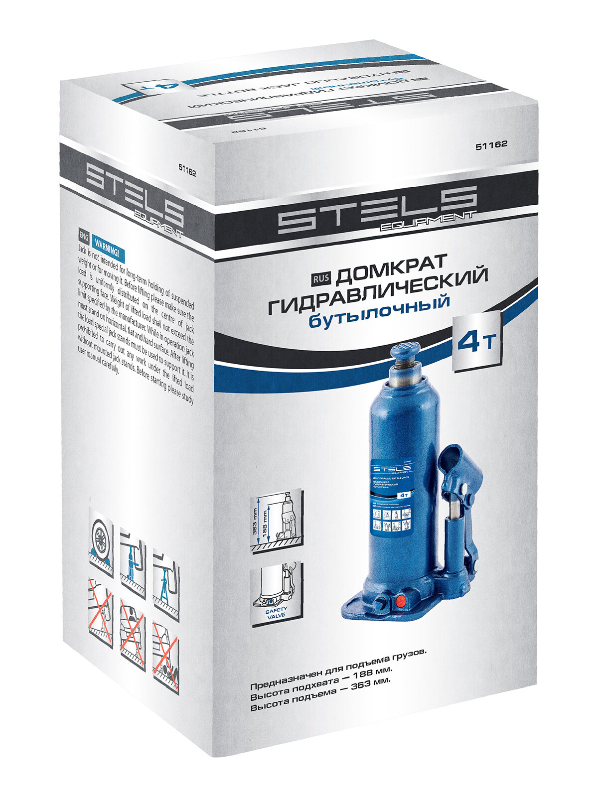 Домкрат гидравлический бутылочный Stels 51162, h подъема 188363 мм, 4 т .