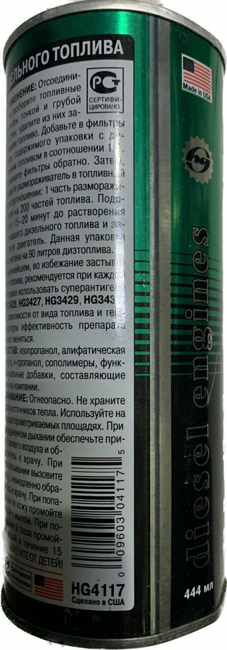 hg !946ml\ размораживатель дизельного топлива. растворяет парафин.