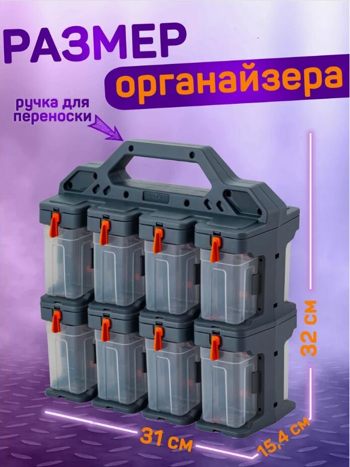 Органайзер Expert универсальный со съемными прозрачными боксами для строительных аксессуаров метизов, гвоздей 8 лотков модулей с подставкой переноской