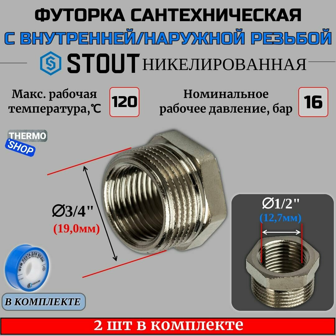 Купить Футорка никелированная 3/4X1/2 2 шт сантехническая для труб, ФУМ лента 10 м