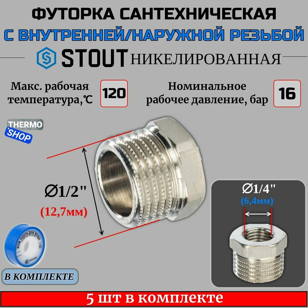 Купить Футорка никелированная 1/2X1/4 5 шт сантехническая для труб, ФУМ лента 10 м