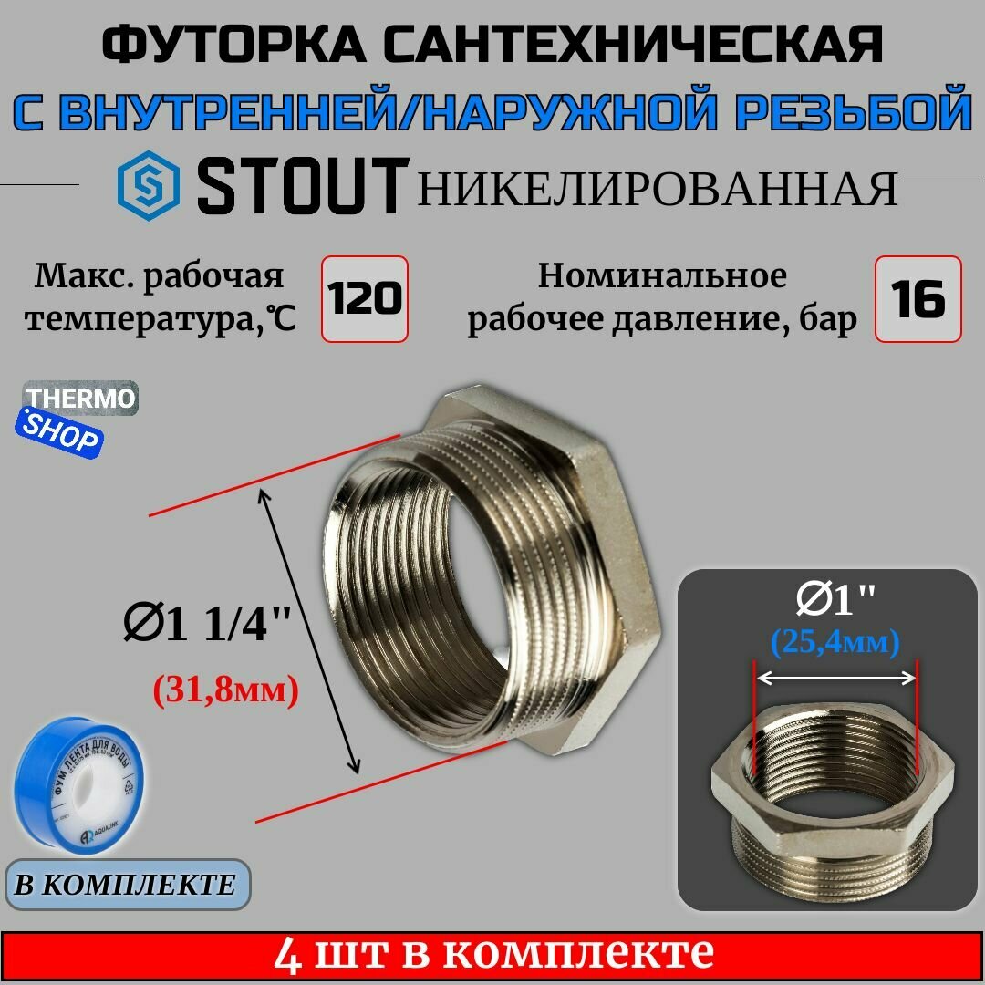Футорка STOUT SFT 0029 - 1"1/2 x 1" (для стальных труб, латунь никелированная)