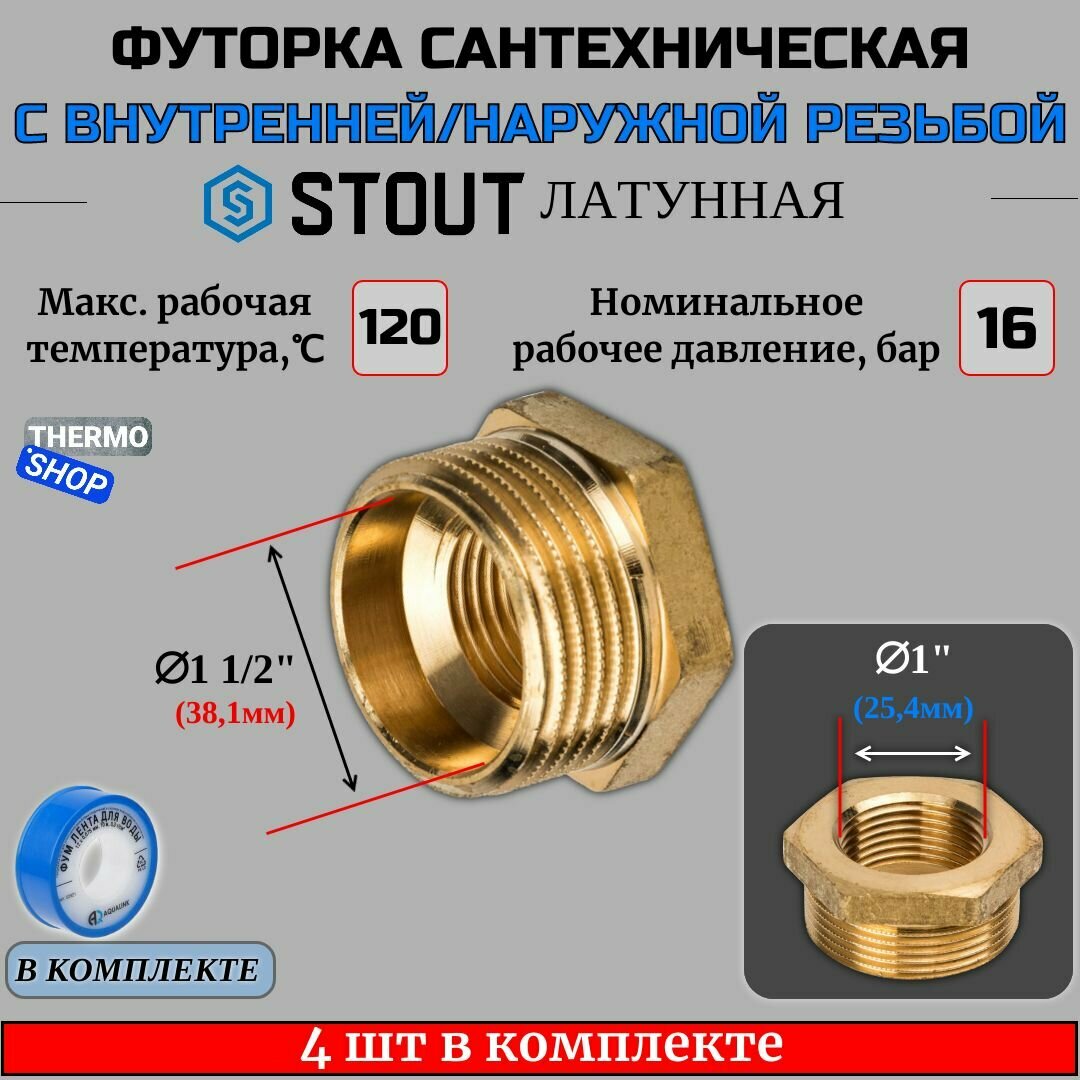 Футорка латунная 1"1/2X1/2 4 шт сантехническая для труб, ФУМ лента 10 м