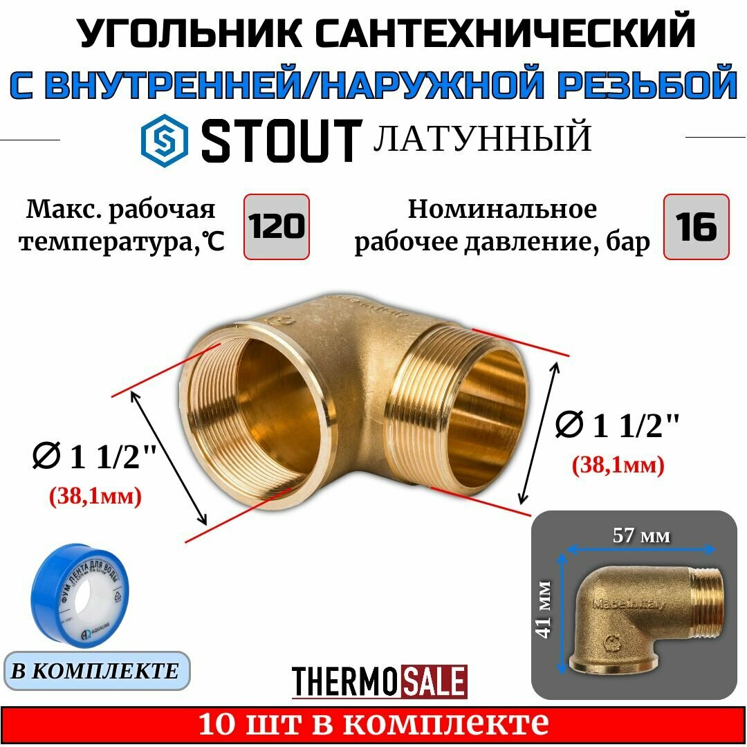 Уголок 1 1/2 НВ 10 шт латунный сантехнический (угол) STOUT ФУМ лента 10 м