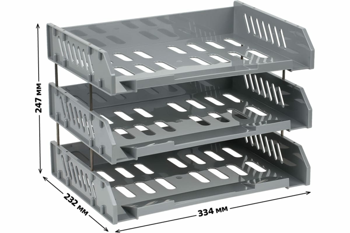 Лоток для бумаг горизонтальный СТАММ набор 3 шт. (335х232х280 мм), на металлических стержнях 60 мм, серые, СТАММ "Сити", ЛТ561
