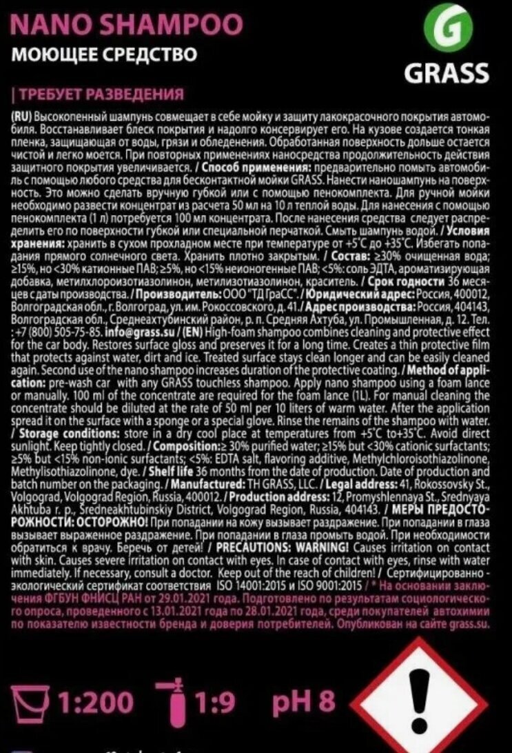 Автошампунь Grass Nano Shampoo Универсальный 1л GraSS арт. 136101