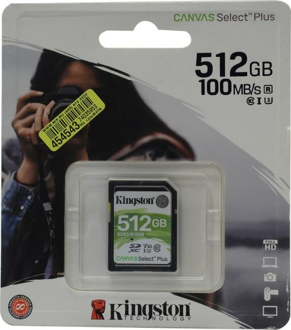 Карта памяти SDXC UHS-I U3 Kingston Canvas Select Plus 512 ГБ, 100 МБ/с, Class 10, SDS2/512GB, 1 шт., без адаптера