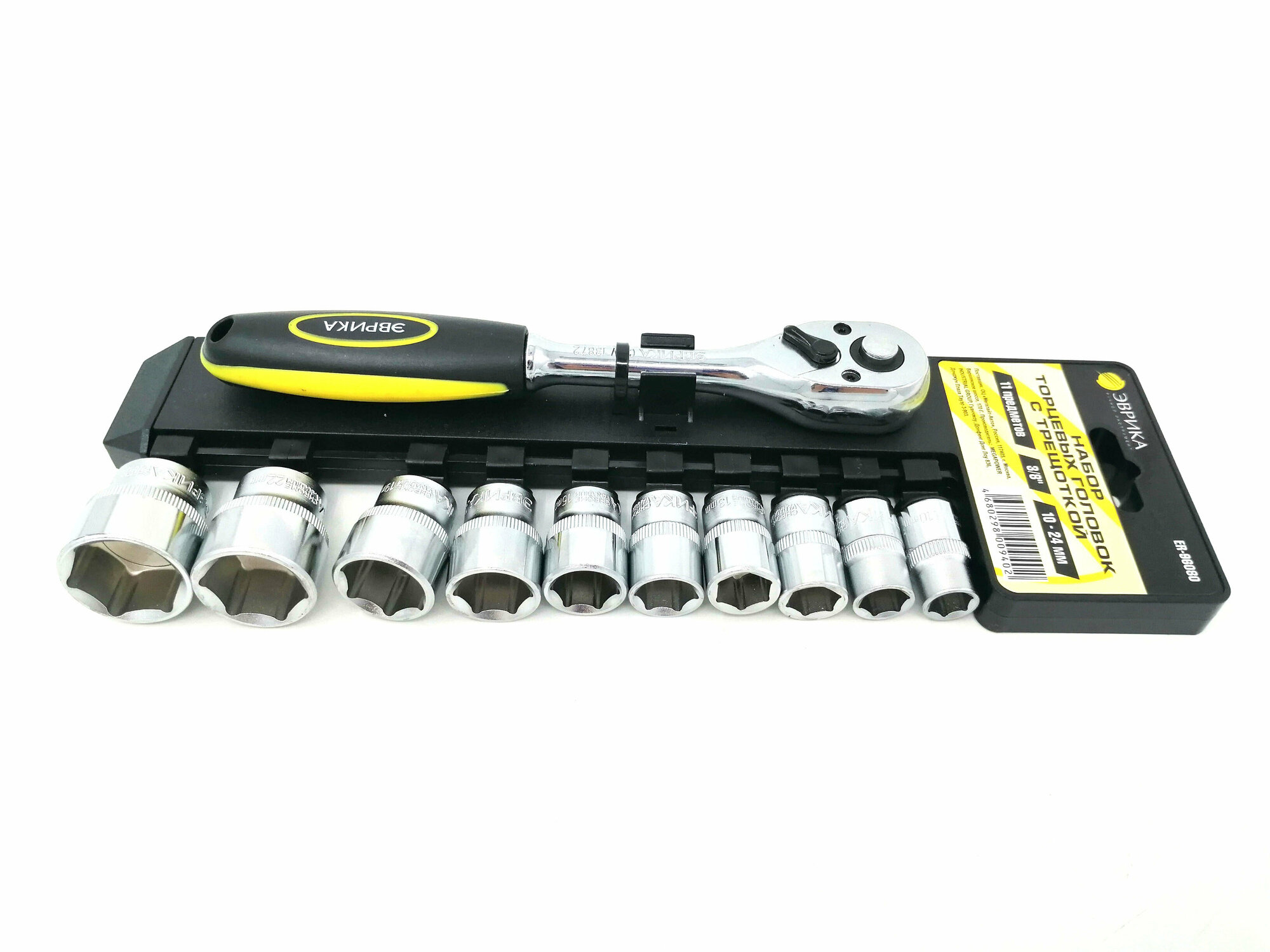 ER-96080 Набор торцевых головок с трещоткой ER-96080 3/8" DR 10-24мм 11 предметов (на держателе)