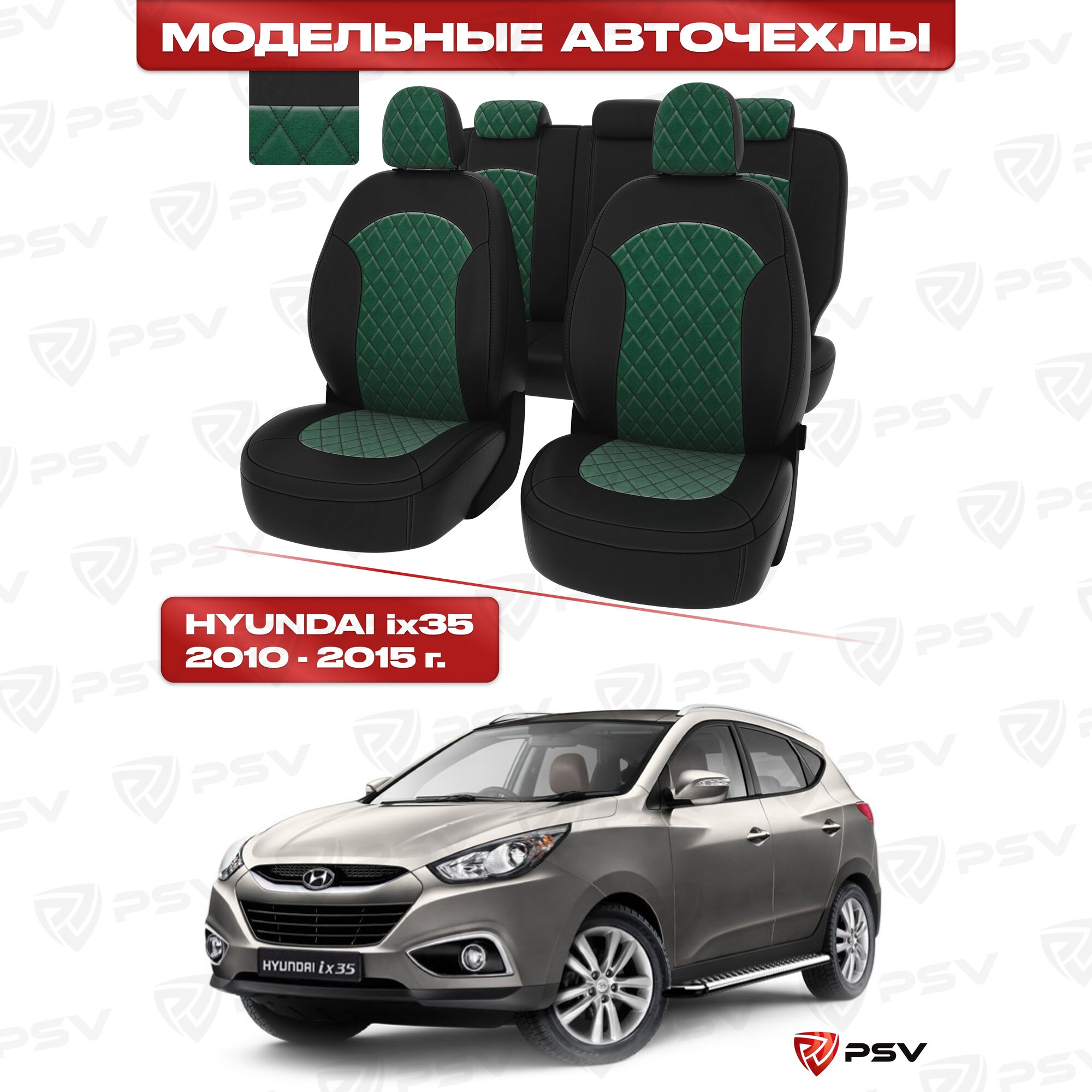 Купить Чехлы в машину PSV для Hyundai ix35 2010-2015 г. - ромб/отстрочка зеленая, черная экокожа + зеленый велюр "Оригинал"