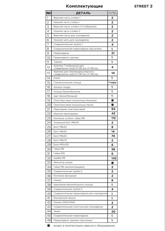 | Минусы: | Вместо двух щитов для скалодрома пришло четыре. Соответственно нехватило перемычек креплений между собой данных деятелей. На основных штангах дополнительно пришлось сверлить отверстия под крепления щитов. Недокомплект - отсутствует сетка для баскетбольной кольца. Очень короткие перемычки соединения трубок скалодрома - не надёжное соединение, "играет" в этих местах. |