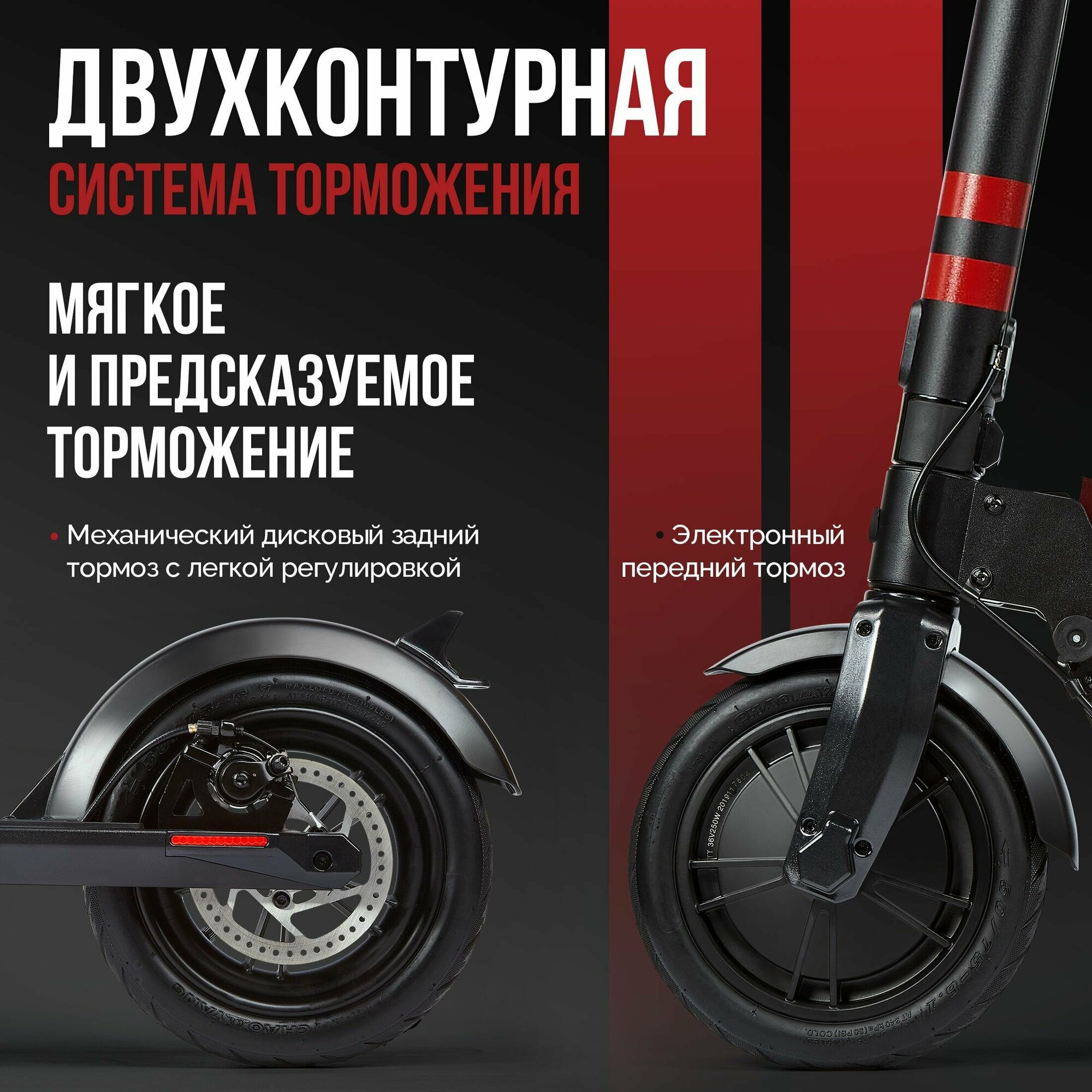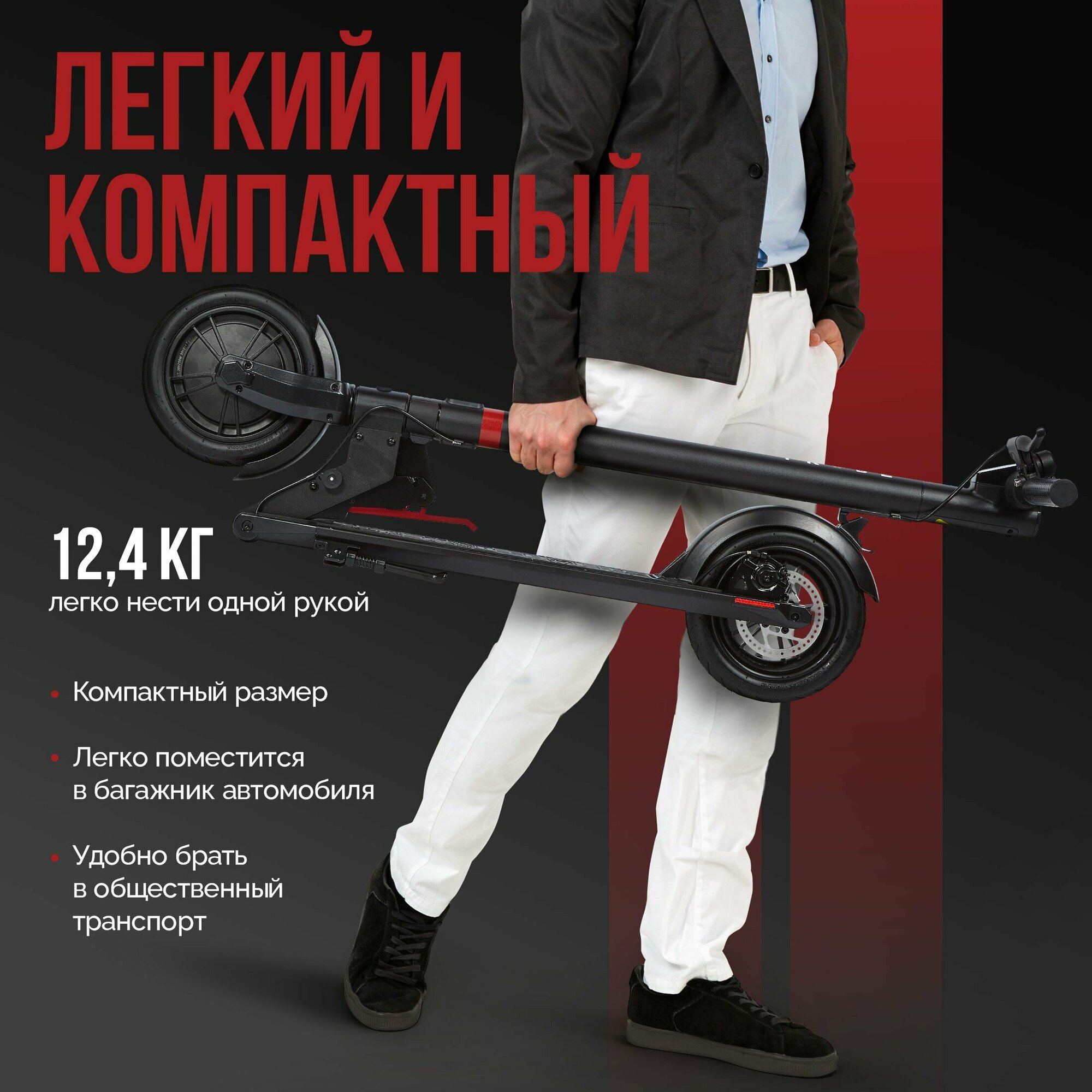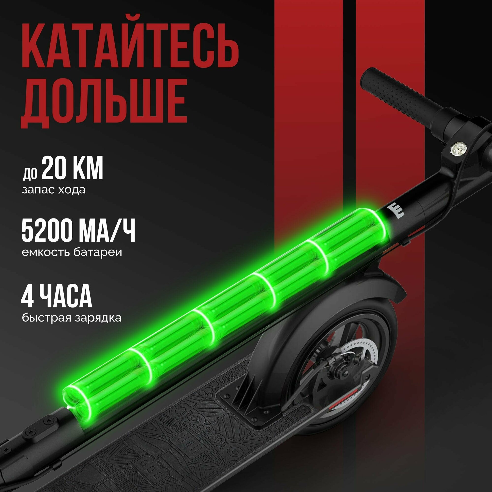 | Плюсы: | Заряда хватает на достаточно долгое время, легко собирается, очень удобно ездить, в том числе как на обычном самокате на случай, если закончится заряд. Очень плавно рулит, мягко набирает скорость, реагирует на степень нажатия кнопки -- если давить слегка, то сильно разгоняться не будет. Дека большая, удобная. Колеса камерные, что дает некоторую способность к бездорожью и плавность хода. |