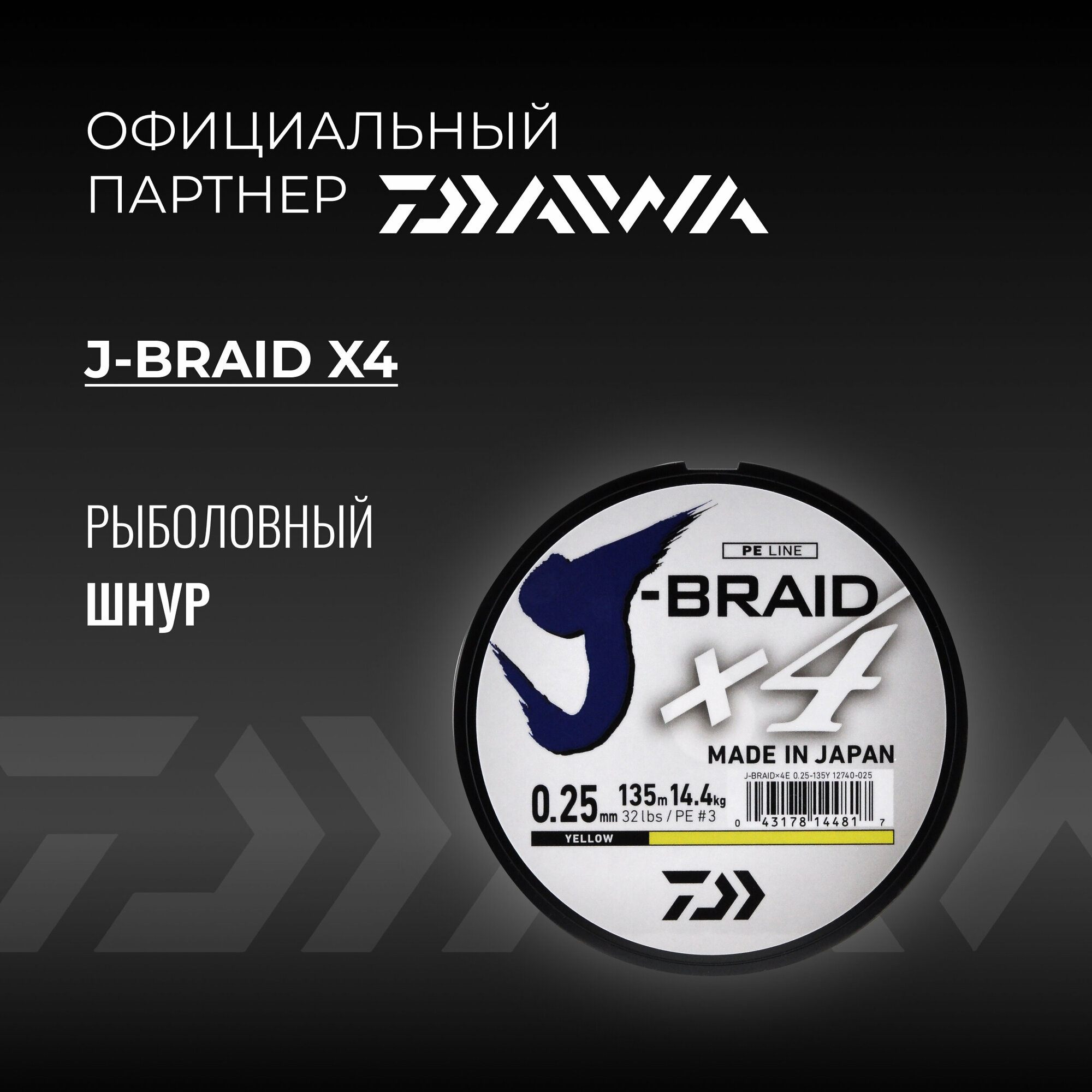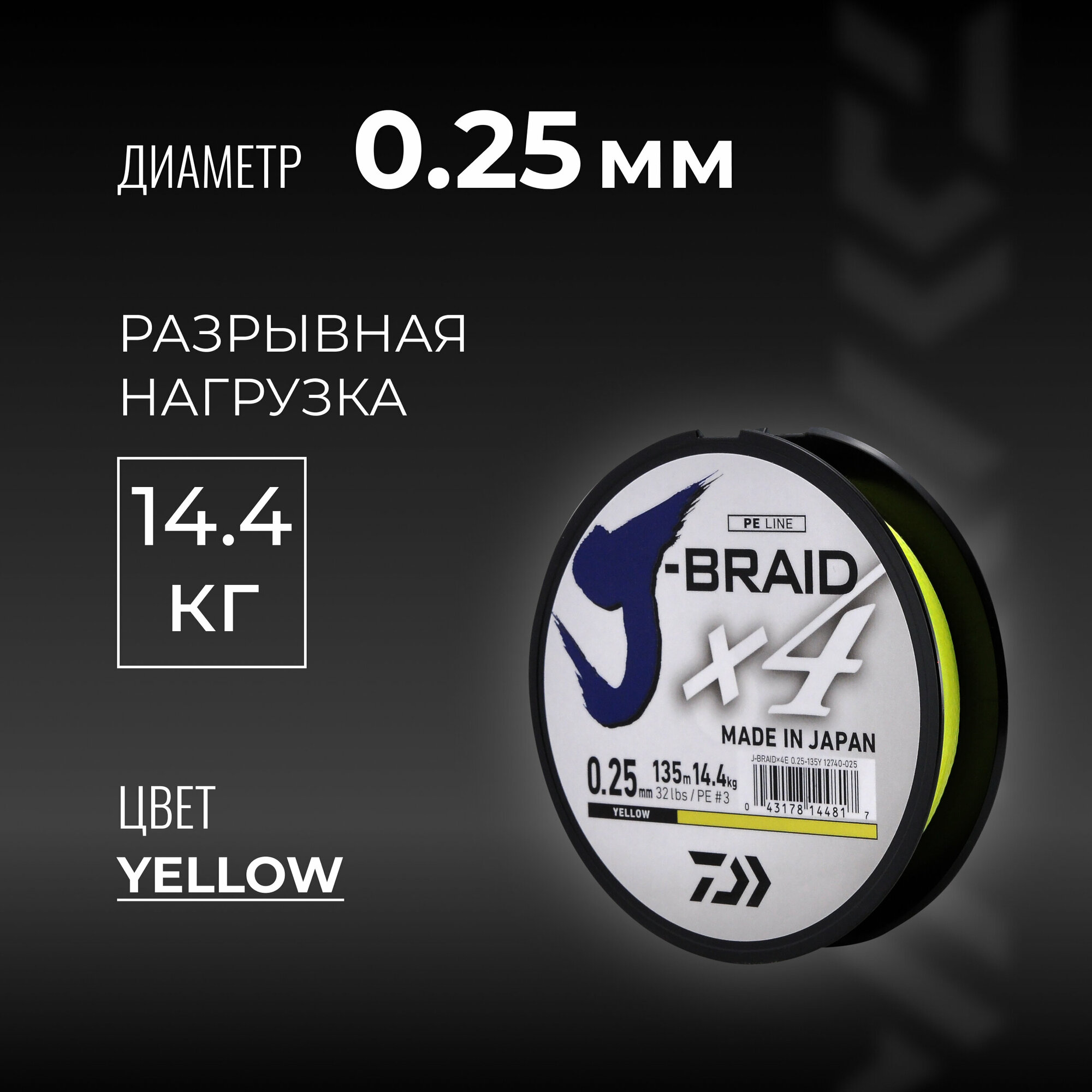 Плетеный шнур для рыбалки Daiwa J-Braid x4 желтый 135 метров 0.25 мм / плетенка для спиннинга