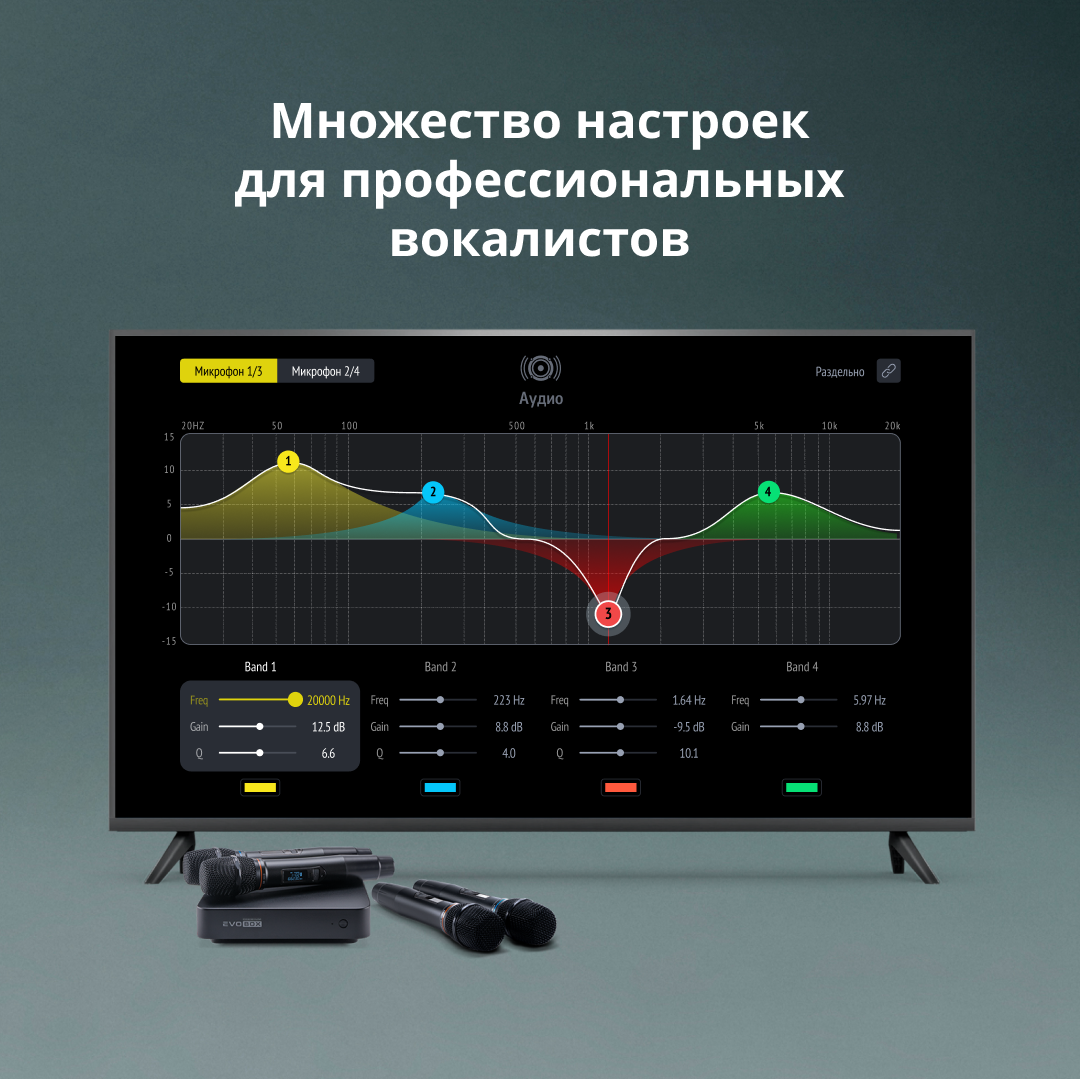| Минусы: | При выборе радио микрофонов проконсультируйтесь с специалистами. У меня akg wms40 mini2 vocal set на частоте 660 и 662 мГц точно от evobox принемают какой-то радиосигнал, поэтому в процессе пения очень сильные щелчки и при выключенном микрофоне сильный шум. |