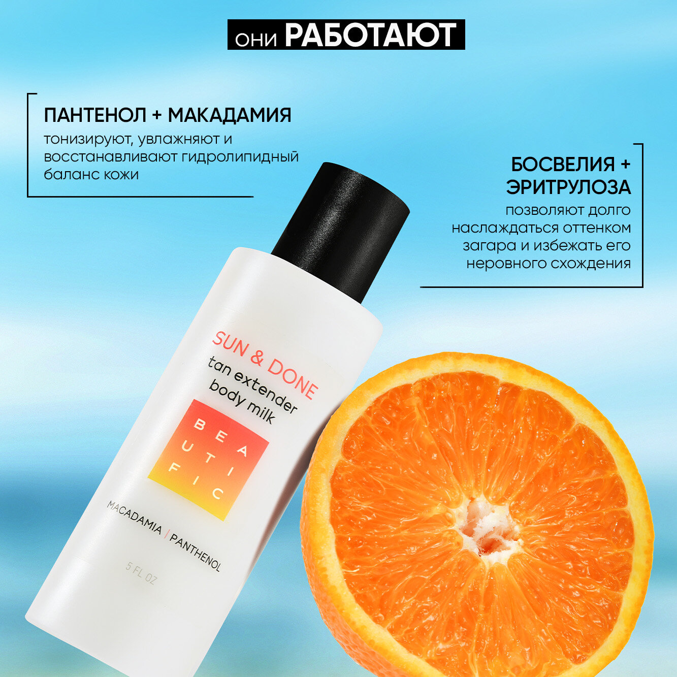 BEAUTIFIC молочко-пролонгатор загара Sun & Done, увлажнение с пантенолом, алоэ и эритрулозой, 150 мл.