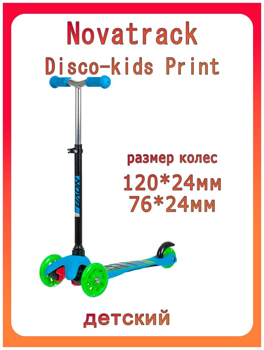 Самокат-кикборд Novatrack Disco-kids Print Basic (2020) (Самокат для детей Novatrack Disco-kids Print, колеса PU пер.120*24 задн.76*24мм, эргономичны)