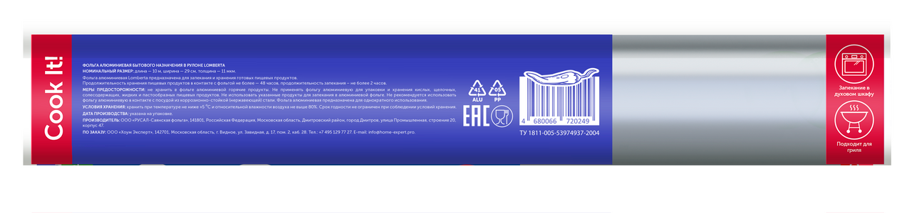 Фольга пищевая Lomberta прочная 11 мкм, алюминиевая в рулоне 50 метров для запекания, выпечки, гриля, хранения еды и окрашивания волос, профессиональная
