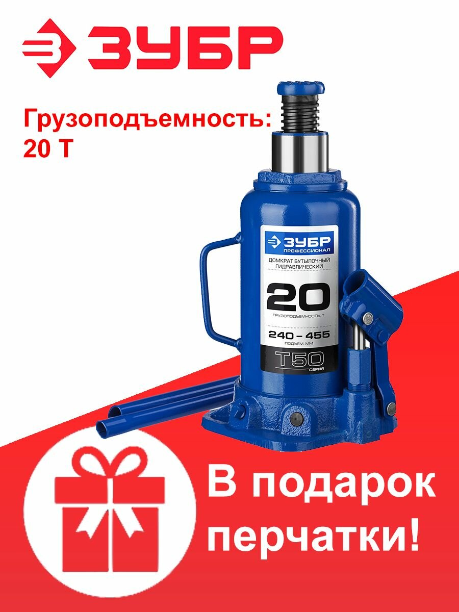 ЗУБР Домкрат гидравлический бутылочный T50, 20т, 240-455мм, ЗУБР Профессионал 43060-20, ( 43060-20_z01 )