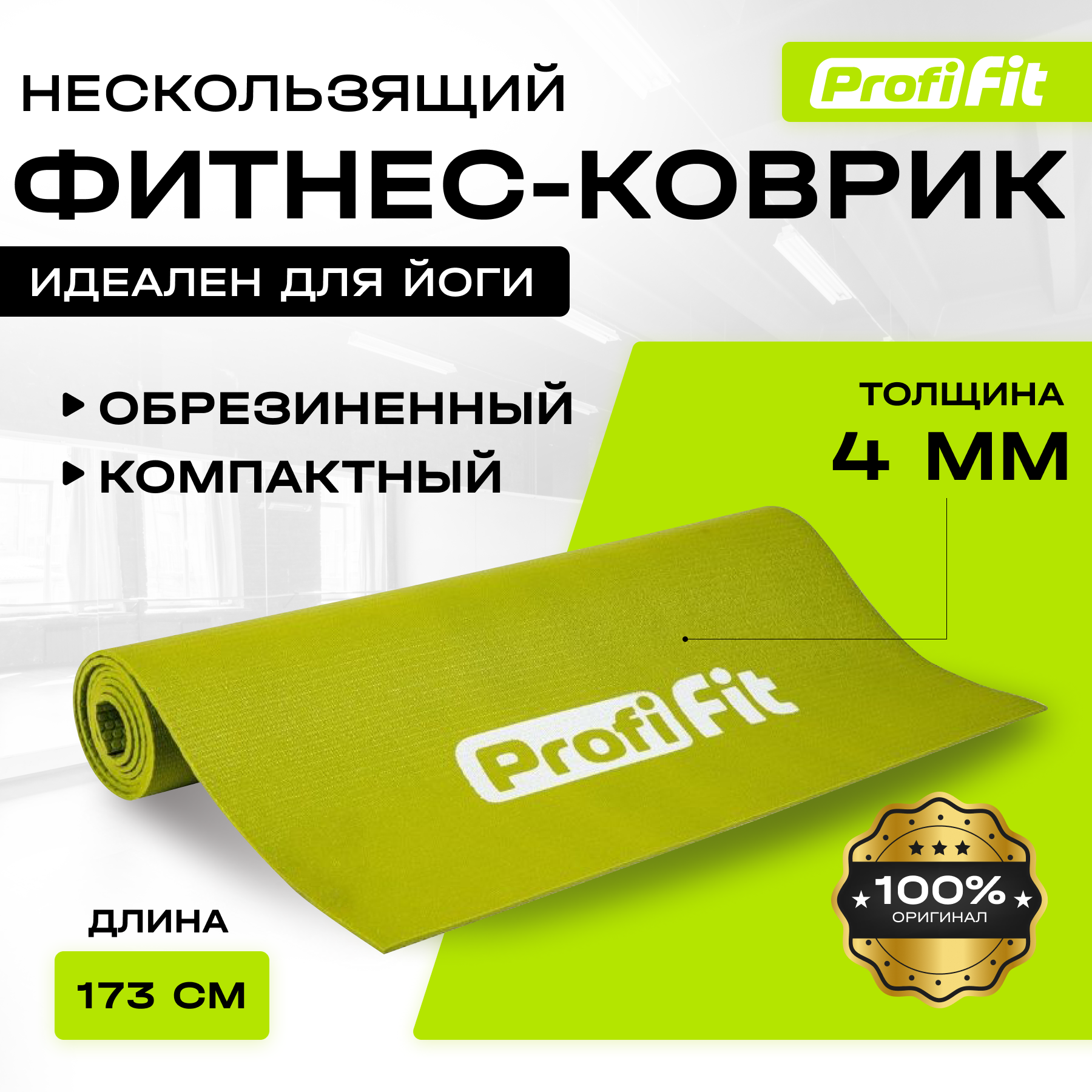 Коврик для йоги и фитнеса нескользящий, PROFI-FIT, ПРОФ, 1730х610, 4 мм, зеленый