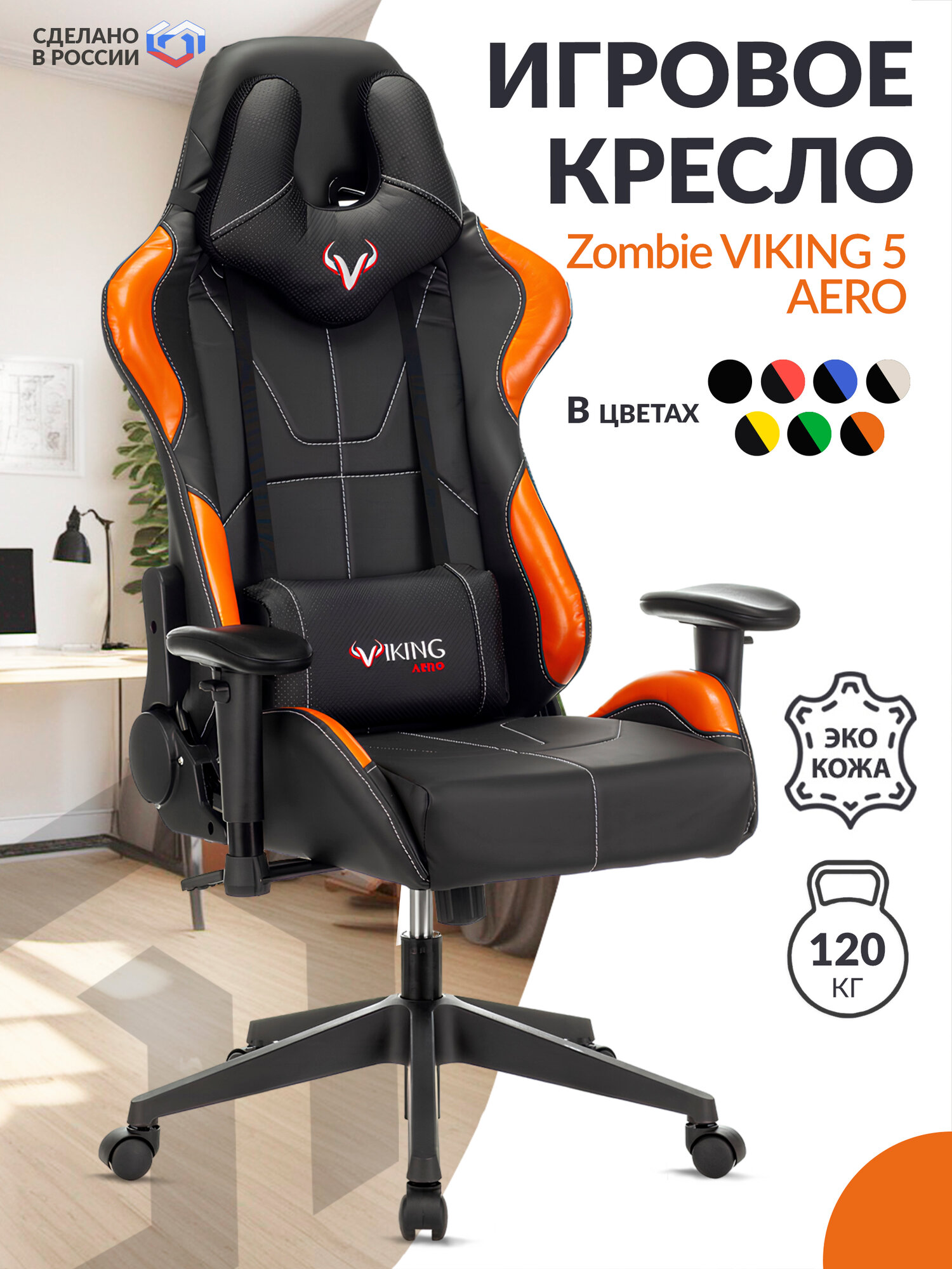 Кресло компьютерное игровое геймерское Zombie VIKING 5 AERO, стул на колесиках, высокой спинкой, c подлокотниками, подушками, экокожа