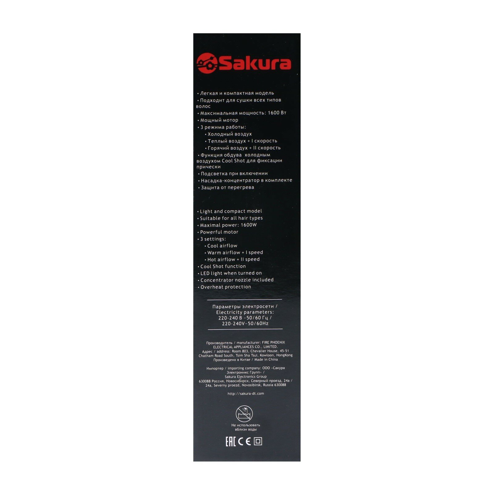 SAKURA Фен Sakura SA-4051GR, 1600 Вт, 3 скорости, 3 темп. режима, концентратор, шнур 1.8 м, зелёный
