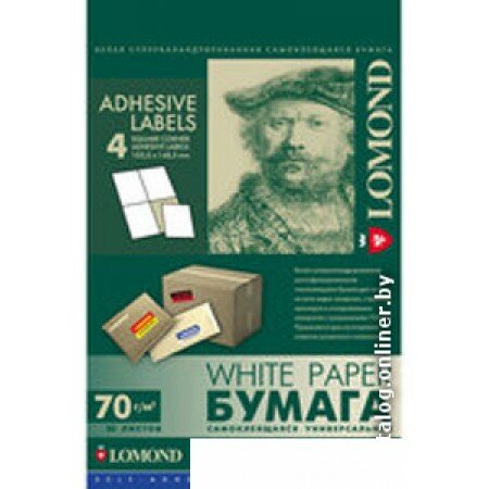 Самоклеящаяся бумага Lomond A4, белая, 4 деления (105 x 148.5 мм), 70 г/м2, для этикеток, универсальна, 50 листов (2100025)