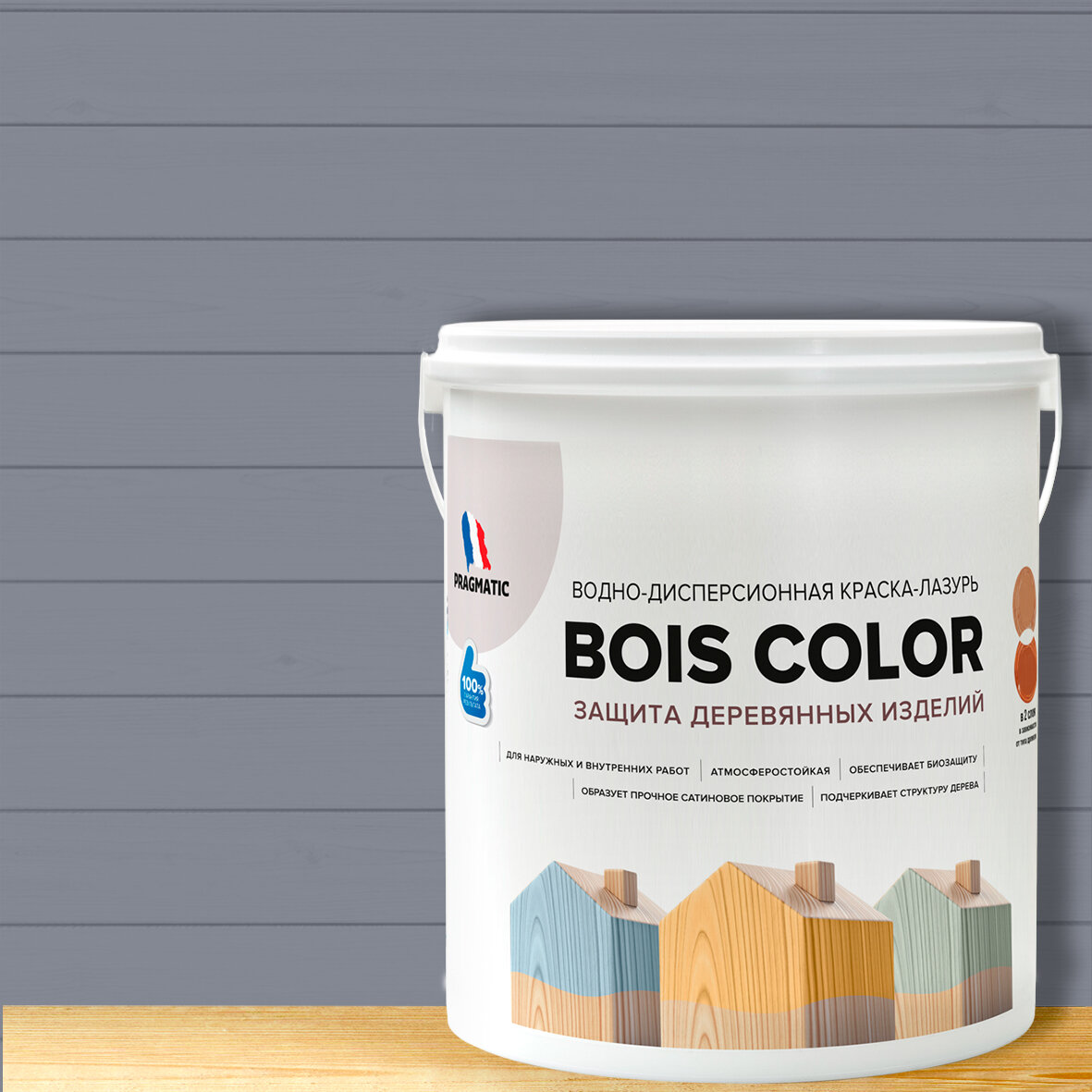 Краска (лазурь) для деревянных поверхностей и фасадов, обеспечивает биозащиту, защищает от плесени, грибков, атмосферостойкая, водоотталкивающая BOIS COLOR 0,9 л цвет Серый 8233