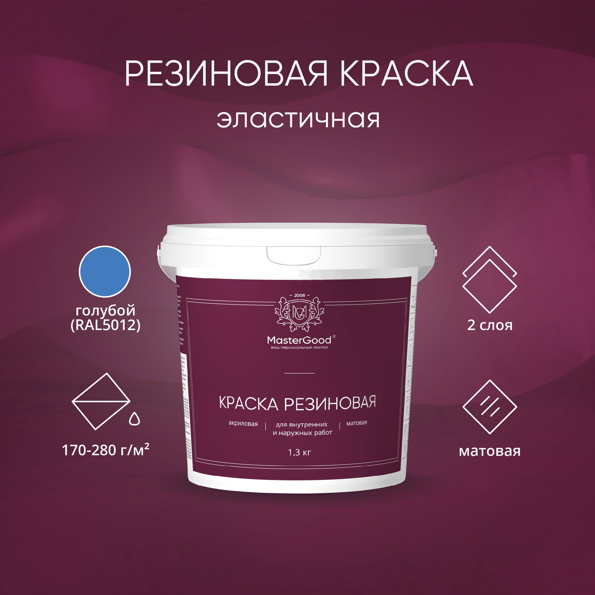 MasterGood Краска резиновая моющаяся акриловая для помещений с повышенной влажностью Голубая (RAL 5012) (1,3 кг)