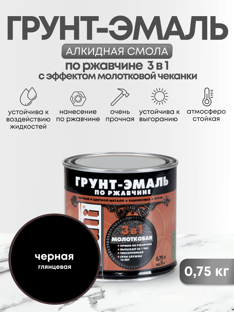 Грунт-эмаль по ржавчине 3 в 1 молотковая черная, 0,75 л