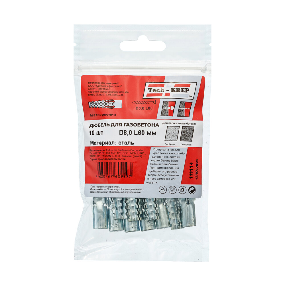 Дюбель для газобетона 8х60 (10 шт) - пакет Tech-Krep