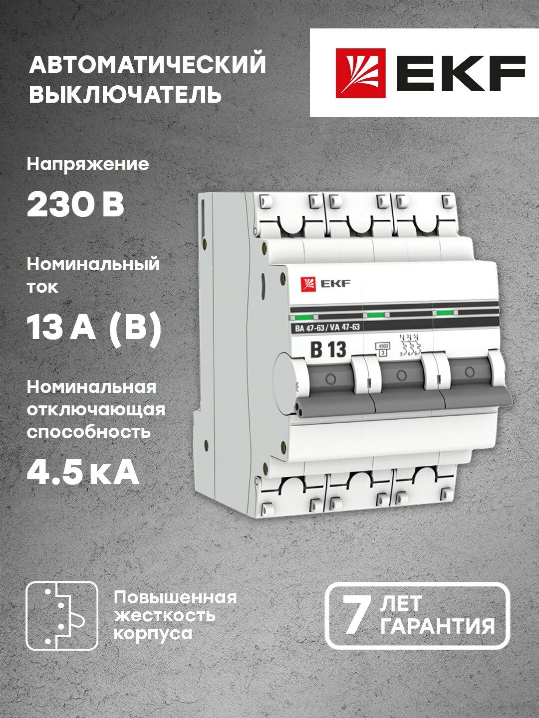 Купить Автоматический выключатель EKF PROxima ВА 47-63 3Р 13А тип B 4,5 кА 660 В на DIN-рейку (mcb4763-3-13B-pro)