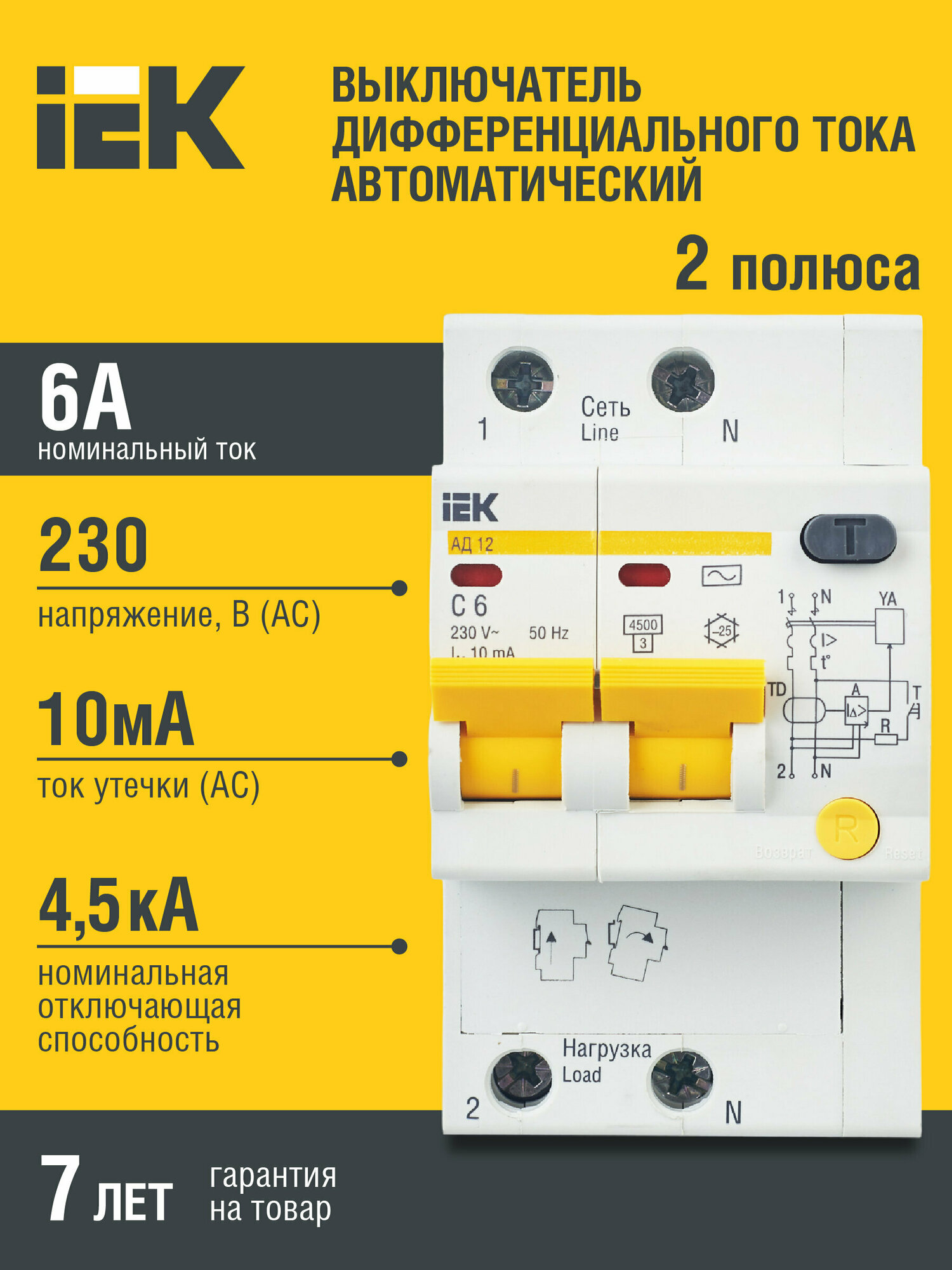 Дифференциальный автомат IEK АД12 (MAD10-2-006-C-010) 6A 4.5kA 10мА 2П