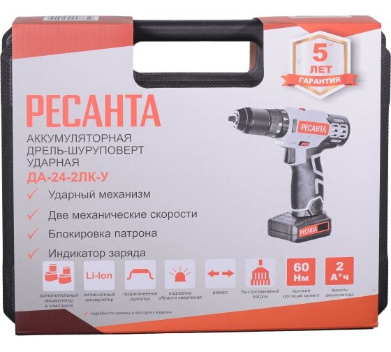 Дрель-шуруповерт аккумуляторная ДА-24-2ЛК-У (ударный) Ресанта